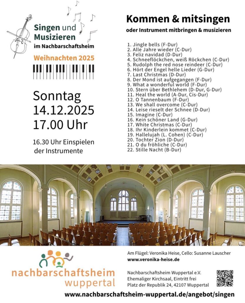Wer mit seinem Instrument im Improvisationsorchester mitspielen möchte, ist bitte um 16.30 Uhr zum Stimmen und Einspielen der Instrumente in Nachbarschaftsheim, in unserem Alten Kirchsaal am Platz der Republik 24-26. Alle Liedtexte zum Singen gibt es am Abend vor Ort.